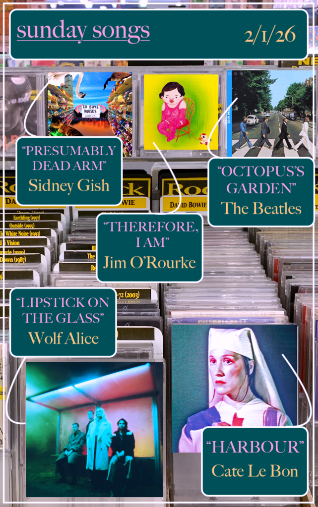 I think “Presumably Dead Arm” was the first song of Gish’s that I ever listened to, and to this day, the charm of it mostly holds up. The sound is so distinctly late-2010’s, complete with the fuzz you get from recording music off of an aging laptop speaker. Now that it’s 2026, I can’t see the title without hearing it in the same cadence as this, yet even so, it’s just such a softly charming little tune. It has a very late teenage kind of wistful melancholy to it, but with the added through line of finding said presumably dead arm in a graveyard (and taking it to prom). Between laments about isolation and drunk and high friends, Gish’s distinct flavor of lyricism shines through: “I’d rather let the poor kid sleep/But he’s tripping balls, he’s tripping testes/LSD, post-wisdom teeth/He got lost in the shower/And he barely knows the hour.” But what hits me now, seven years after I initially found this song, is the genuine fear hidden behind some of the lyrics, the kind you can only get when you’re approaching your 20’s and don’t have a clue what you’re going to do about growing up: “And all these pretend spouses are a happy storybook/That’ll turn to stark non-fiction in the time it took/For me to notice that I’m old, which means I’ll be thirty and happy/Likely married to personified business-casual khakis.” As silly as some of those lines are, they’re delivered with such an urgency that for a fleeting moment, I feel them like a skipped heartbeat in my ribcage. It’s uncanny, how quickly Gish can switch from abject silliness to existentialism. But that’s very Gen Z—and very Sidney Gish, in the end.