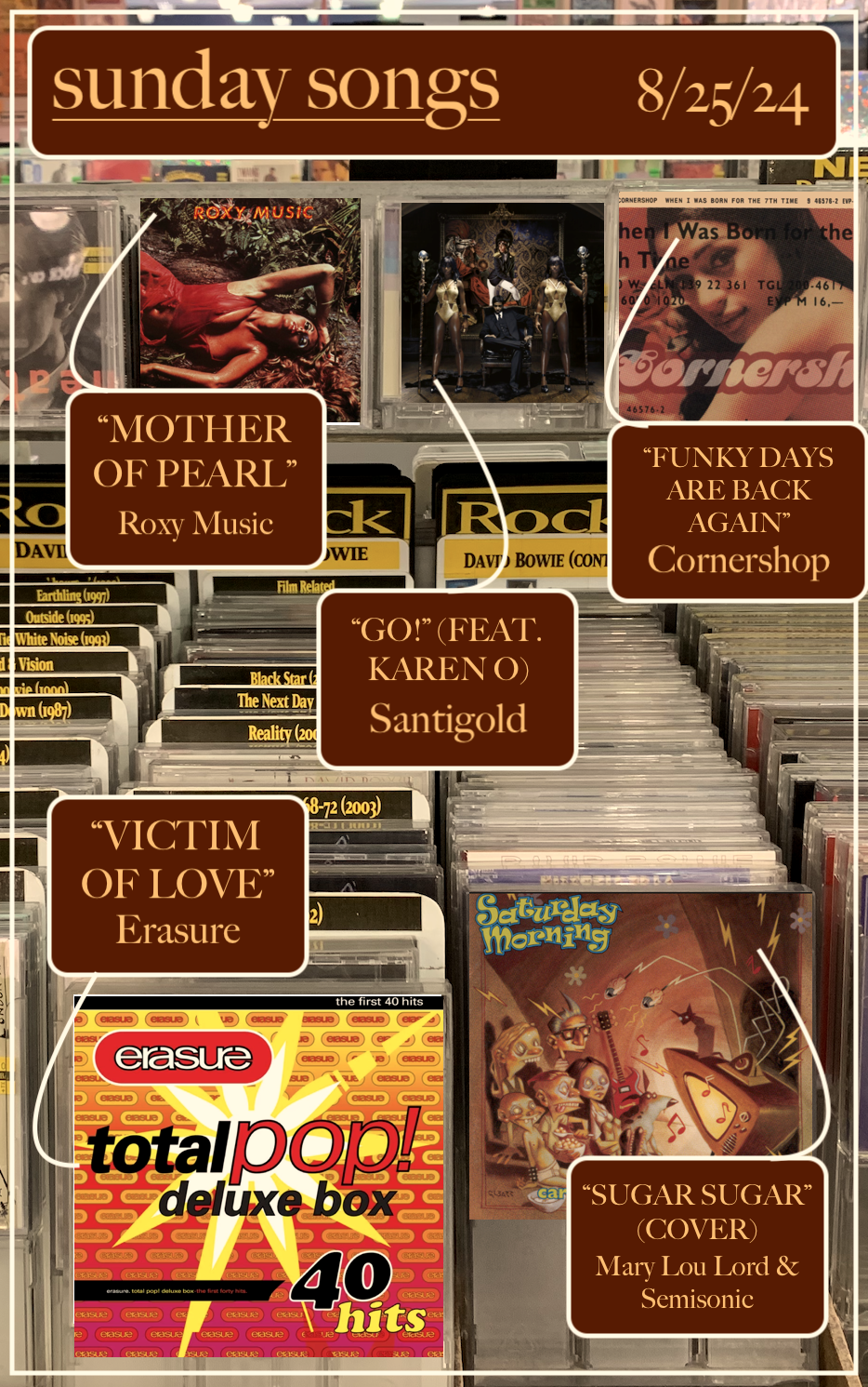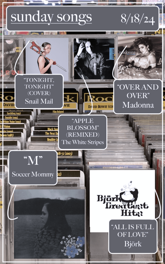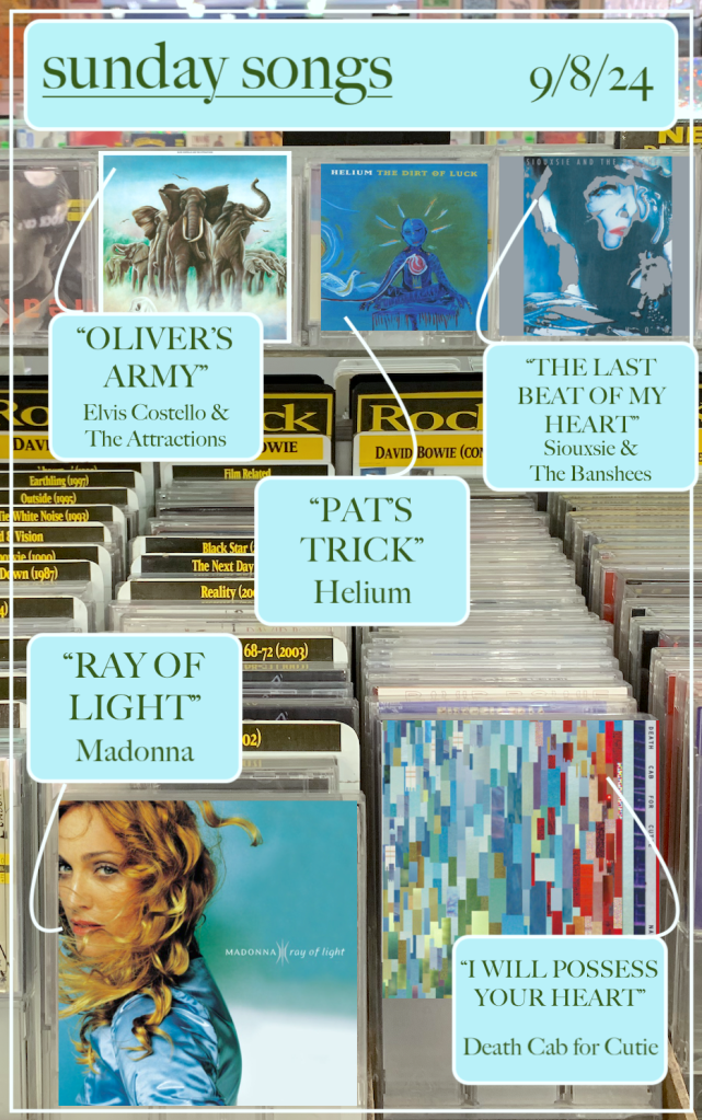 Before I get into today’s songs, I’ve also compiled my graphics for the last few weeks when things got busy. I made them (because I love making silly little graphics and giving them silly little color palettes), so, for your casual perusal, here they are: