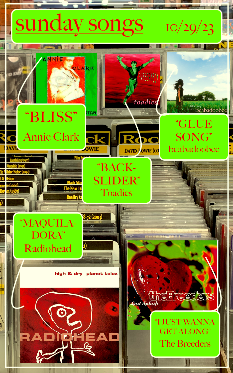 I suppose this could be the closest to Halloweeny that this week’s songs come to, but I really should’ve gone with something like “Possum Kingdom” if we wanted some real Halloween. Alas, “Backslider” was on the brain more. But that’s not a complaint—I’ve been coming back to this, the aforementioned vampire song, and “I Come From the Water” since 8th grade, and I have nothing but fond memories of them. That chugging, grinding guitar never fails to hook me just like it did when I was 14; there’s a dark grime clinging to every Toadies song I’ve ever heard, muddy and hazily dark, like the humidity that clings to your forehead at night in the South. (A feeling that they probably knew well, what with the band hailing from Texas.) The flies lingering around the band in the video really tie it all together. It’s a sludgy, eery texture that pairs with everything I’ve heard of theirs, but especially with this, a series of vignettes of Todd Lewis’ Southern, Christian upbringing and the creeping dread ever-present within it. All crammed in just over two and a half minutes, all of that grime and dread is as tight as ever—not polished, but sculpted into something fully-formed.