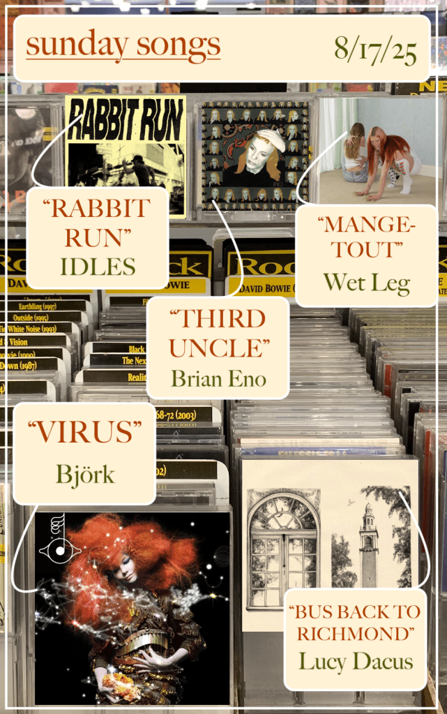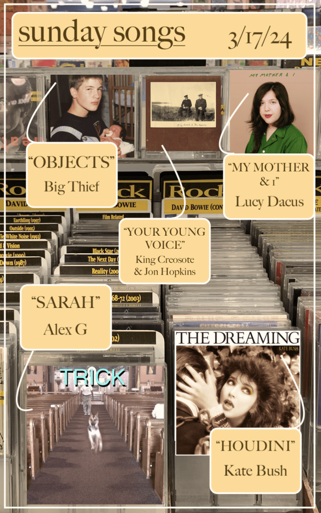 To my surprise, “Bullseye” has become one of my most played songs from the album. There’s something so tender about it that reminds me of Dacus’ older work. I think what sets Dacus’ songwriting is that every emotion comes through in the most unexpected vignettes—the opening lines of “Next of Kin” (“Reading in the phone booth/Sucking on a ginger root”) come to mind. She has such a keen, observational eye that decorates her songs with the most unique setpieces, like some kind of musical bowerbird building a nest. While the ones in “Bullseye” stand out as more obviously romantic (carving locks into initials on bridges, reading annotations in your lover’s books), it’s so clear how much it shapes her songwriting. She admits it herself: “Found some of your stuff at my new house/Packed it on accident when I was movin’ out/Probably wrong to think of them as your gifts to me/More like victims of my sentimentality.” She’s a kind of museum curator of fleeting, stolen moments, which make up the core of “Bullseye.” And although Hozier isn’t normally my cup of tea, his voice with Dacus’ makes up such rich, heartstring-tugging harmonies that give the song an added layer of tender warmth.