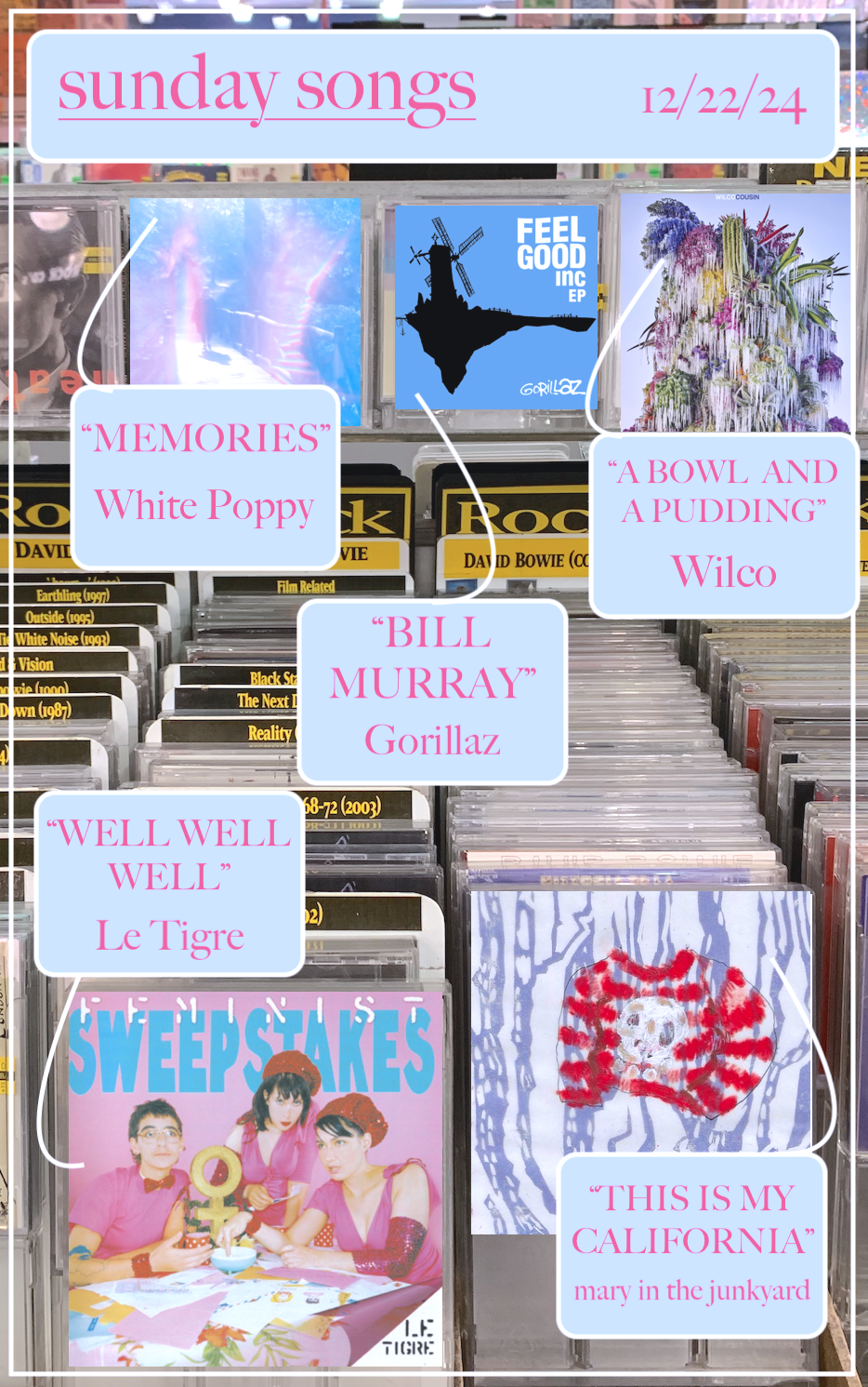 “this is my california” is one of their gentler, more restrained efforts (you’ll see what I mean next week…stay tuned), but even their restraint feels fresh somehow. I’ve pinpointed several comparisons for mary in the junkyard, but the one that immediately comes to mind for this track is Luna. From the easygoing, sidewalk-ambling pace to the warm pulsation to guitars to…well, you can’t blame them for the California part. It doesn’t help that “this is my california” rings close to “California (All the Way),” but it doesn’t feel like a rip-off—in fact, that wide body of songs about California makes the pairing enhance the lyrics. Freeman-Taylor has never been to California, but described it in an interview with Northern Transmissions as “a paradise or idea of success that didn’t really resonate with me.” Her California, as it I’m sure it is for hundreds of people, owing to Hollywood and its side effects, is an ideality, but one that’s just out of reach—”My dream/Comes from the pale light of a bright blue screen.”